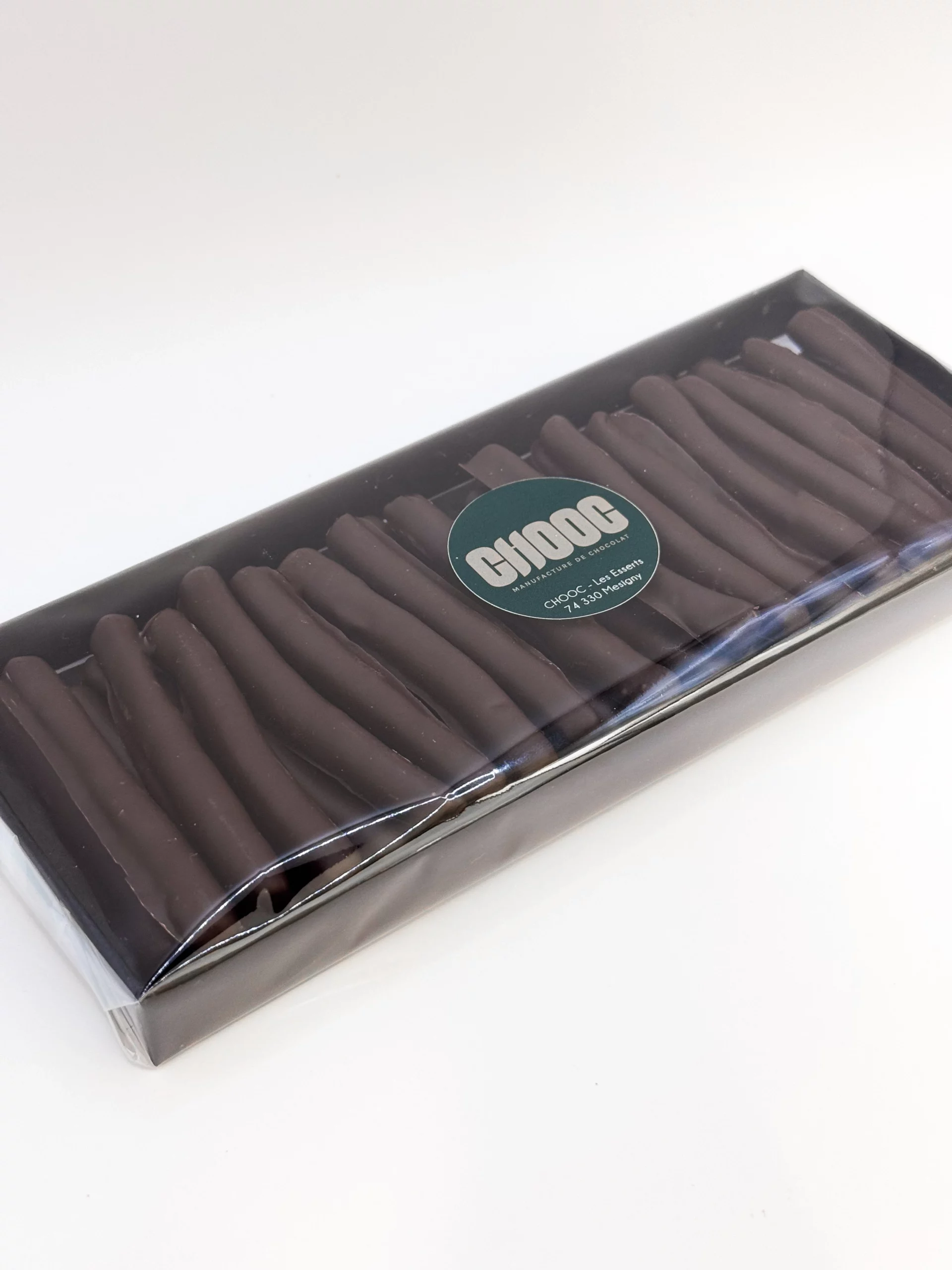 Nos orangettes en chocolat noir sont le mariage parfait entre des écorces d’orange confites lentement pour révéler toute leur saveur et un enrobage de chocolat noir intense. Fabriquées artisanalement, elles offrent une texture fondante et un goût délicatement équilibré entre douceur et légère amertume. Idéales pour accompagner un café, offrir un cadeau gourmand ou simplement se faire plaisir avec une confiserie élégante et savoureuse.
